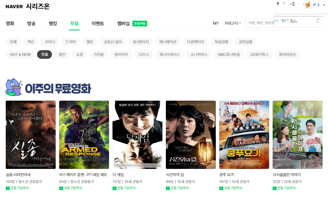 시리즈온에 접속해서 맨 위에 메뉴에서 무료를 클릭하면 이번 주에 볼 수 있는 무료영화 목록을 볼 수 있습니다.