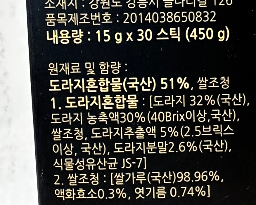 제가 추천하는 도라지청 스틱은 생도라지 발효청입니다. 앞에서 살펴 본 기준에 따라서 하나씩 살펴볼께요.