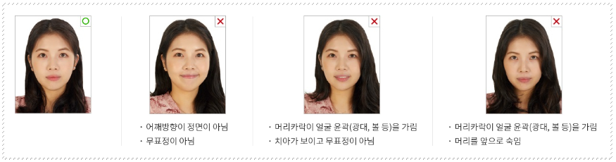 - 머리카락이 눈, 이마, 얼굴 윤곽을 가리면 안됨
