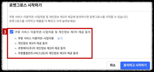 홈 화면에 아래와 같이 로켓그로스 알아보기 화면이 보이는 경우는 바로 신청하기 버튼 누르고 동의하면 됩니다.