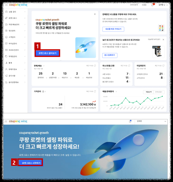 판매 이력이 부족한 경우 홈 화면에 로켓그로스 알아보기가 보이지 않을 겁니다.