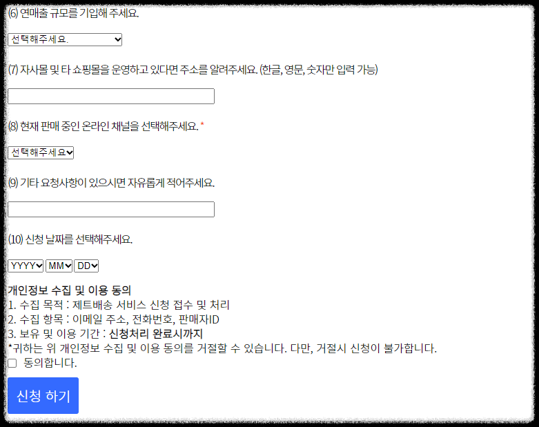모든 양식을 입력하였다면 하단의 신청하기 버튼을 누르고 기다립니다. 이렇게 신청하고 기다리면 로켓그로스 담당자로부터 연락이 올 것이고 안내에 따라 진행하면 됩니다. 이상 쿠팡 로켓그로스 신청 방법에 대해서 알아봤습니다.