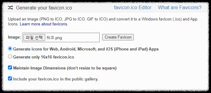 파일 선택 > Create Favicon
