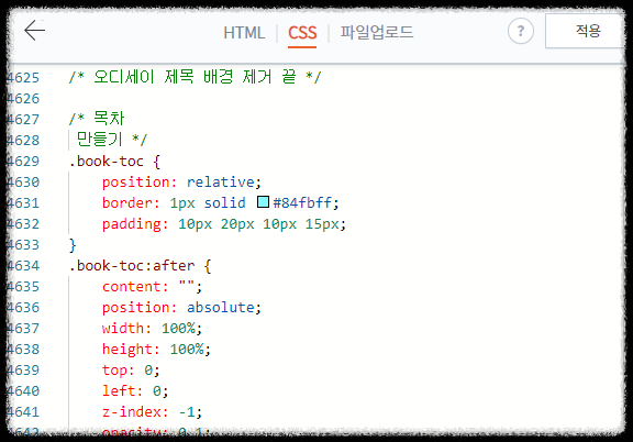 CSS코드에서 목차 테두리 색과 두께, 글자색 변경이 가능합니다.