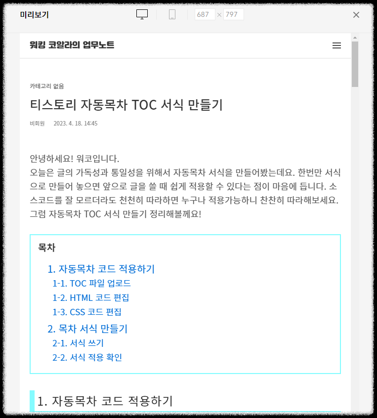 지금 쓰고 있는 글처럼 자동목차가 저절로 만들어 졌다면 셋팅이 완료된 것입니다. 제가 원하는대로 결과물이 잘 나온 것 같습니다. 그럼 자동목차 TOC 서식 만들기에 대한 글을 마무리할께요.