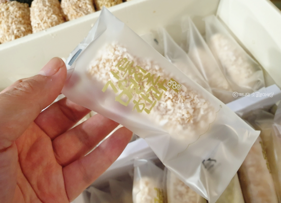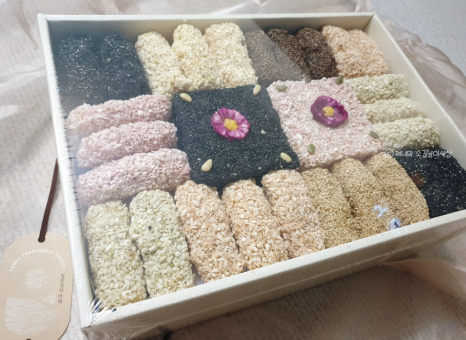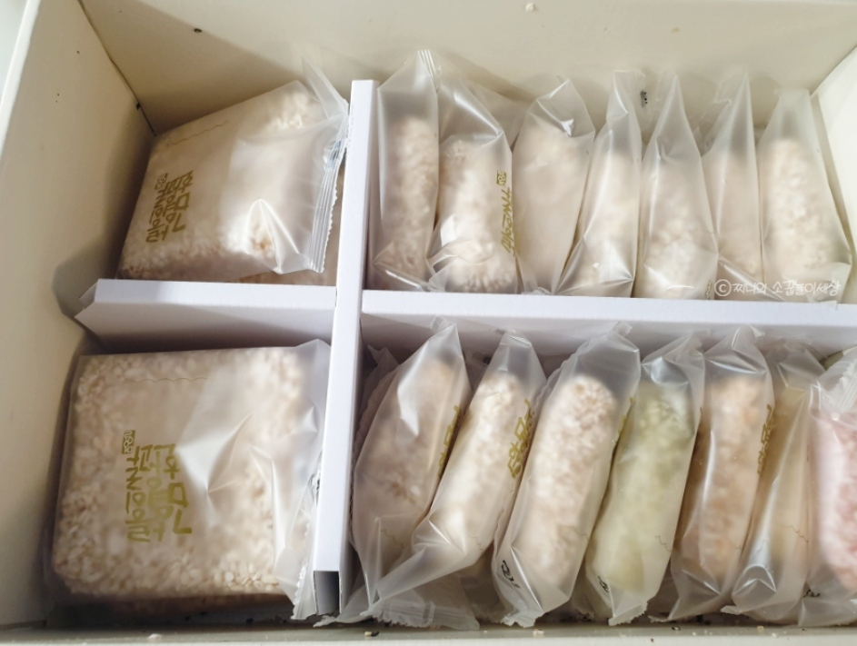 그리고 그 아래 칸에는 개별포장된 한과들이 빼곡하게 담겨있습니다. 한과를 별로 안좋아하시는 분들의 이유가 바로 눅눅한 한과를 먹었던 기억 때문일텐데요. 저렇게 개별포장하면 한과를 오랫동안 더 신선하게 먹을 수 있습니다.